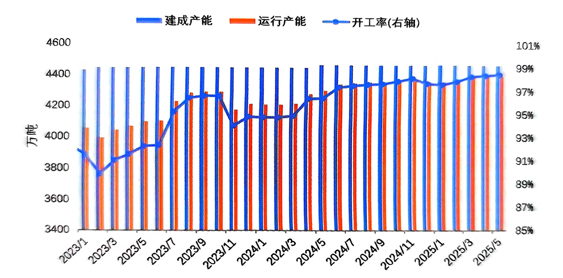 2025年5月,國內電解鋁生產能力穩(wěn)中有增,截至5月底建成產能4467萬噸/年,運行產能4397萬噸/年,環(huán)比增加4萬噸/年。本月運行產能增量主要來自青海等新增項目的釋放;云南等部分地區(qū)新建項目持續(xù)投產,但產能指標均來自在產產能的置換,部分省份的產能和產量將會受到影響,但整體生產能力理論上不會因此而發(fā)生變化。經調整,4月份產量為362.4萬噸;預計5月份產量為374.6萬噸,同比增長2.5%,日均產量12.08萬噸,與上個月基本持平。