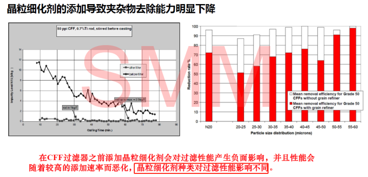 據(jù)丁總調(diào)查顯示,常用細(xì)化劑會(huì)對(duì)CFF過(guò)濾器的過(guò)濾性能產(chǎn)生負(fù)面影響,并隨較高的添加速率而惡化,并顯示晶粒細(xì)化劑種類對(duì)過(guò)濾性能影響不同。據(jù)業(yè)內(nèi)相關(guān)試驗(yàn)調(diào)查,鋁鈦碳或因無(wú)TiB2,從而減少對(duì)CFF過(guò)濾器的吸附、堵塞,會(huì)大大降低細(xì)化劑對(duì)過(guò)濾器性能的影響。