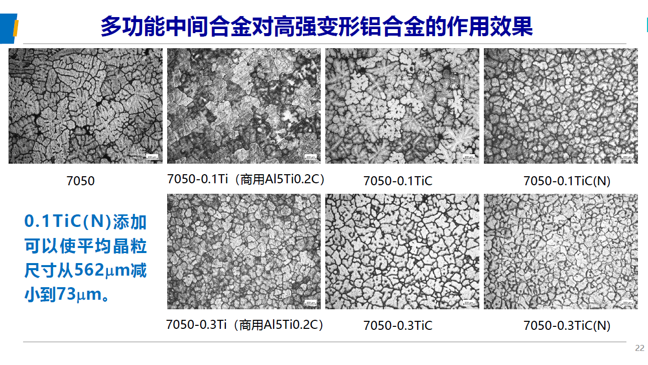 隨著新興的綠色鋁加工聚集區(qū)的建立,新的鋁加工熔鑄產(chǎn)能也隨著電解鋁產(chǎn)能的轉(zhuǎn)移而新興,整體鋁加工熔鑄產(chǎn)能持續(xù)擴(kuò)充,加劇了行業(yè)競爭的激烈程度,促動(dòng)了整個(gè)鋁加工行業(yè)產(chǎn)品及技術(shù)的加速升級(jí)和進(jìn)步。本次峰會(huì)北京航空航天大學(xué)云南創(chuàng)新研究院肖文龍博士發(fā)表了題為“Al-TiC(N) 多功能中間合金的制備及應(yīng)用”的報(bào)告,首次系統(tǒng)性的展示了鋁基TiC增強(qiáng)復(fù)合材料,通過晶粒細(xì)化、復(fù)合強(qiáng)化、組織優(yōu)化等途徑,對(duì)于鋁合金基體的常溫、高溫力學(xué)性能的大幅提升。作為公司的戰(zhàn)略儲(chǔ)備技術(shù),我司峰越科技已開始6%TiC含量鋁基碳化鈦顆粒增強(qiáng)材料的工業(yè)化批量生產(chǎn),并成功應(yīng)用于6xxx系合金的強(qiáng)化、2219合金強(qiáng)化、7034焊絲以及增材制造材料的生產(chǎn)。
