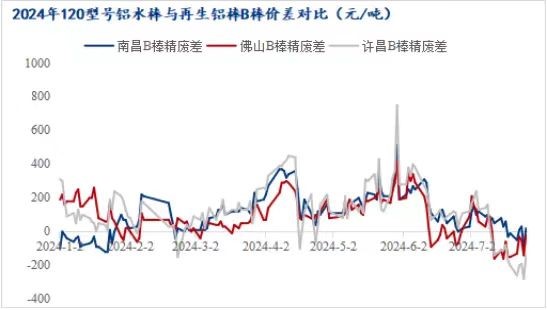隨著鋁價(jià)的大幅回落,鋁水棒加工費(fèi)也逐步回歸至往年中高位置。而再生鋁棒受廢鋁原材料高企制約,加上鋁價(jià)持續(xù)回落,企業(yè)長期處于虧損狀態(tài),再生鋁棒價(jià)格相比鋁水棒價(jià)格表現(xiàn)更加堅(jiān)挺。就B棒而言,目前周均結(jié)算加工費(fèi)在200-400元/噸,點(diǎn)價(jià)結(jié)算加工費(fèi)在350-550元/噸,價(jià)格已趕超原生棒價(jià)格。7月份B棒精廢差在-300~100元/噸區(qū)間震蕩盤整,且長期處于負(fù)值,精廢差倒掛。在高生產(chǎn)成本下,企業(yè)不得不集體挺價(jià)保利接單,下游對(duì)目前價(jià)格接受度有限,多采購原生棒居多,再生鋁棒市場需求遇冷。