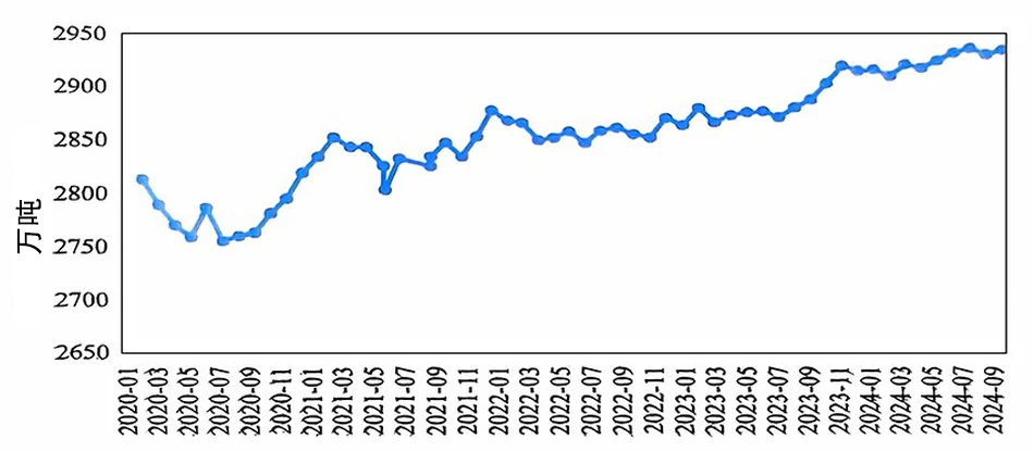 2024年10月,國(guó)內(nèi)電解鋁繼續(xù)保持穩(wěn)定生產(chǎn)。10月國(guó)內(nèi)電解鋁建成產(chǎn)能4462萬(wàn)噸/年,運(yùn)行產(chǎn)能4363萬(wàn)噸/年,較上月增加12萬(wàn)噸/年,主要因?yàn)樗拇ā①F州等地技改產(chǎn)能逐步復(fù)產(chǎn)及新疆置換項(xiàng)目啟槽。本月開(kāi)工率約98%,為歷史新高。10月份產(chǎn)量為373萬(wàn)噸,環(huán)比增長(zhǎng)3.4%,同比增長(zhǎng)2.1%,日均產(chǎn)量12.0萬(wàn)噸,環(huán)比持平。